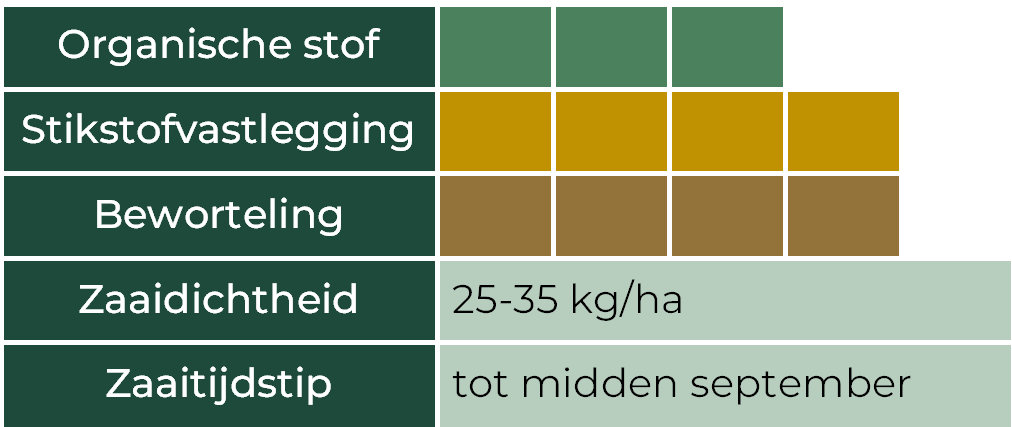 Ideaal voor late inzaai na de hoofdteelt. De snelle beginontwikkeling onderdrukt onkruid, terwijl diepwortelende soorten mineralen uit lagere bodemlagen mobiliseren.