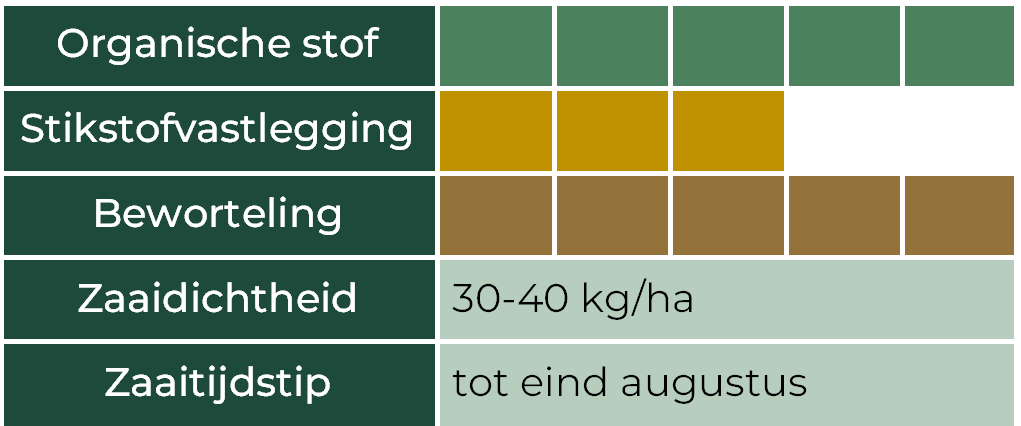 Ideaal na vroegruimende gewassen. Vroege zaai zorgt voor diepe wortelgroei en veel fotosynthese, wat leidt tot maximale productie van wortelexudaten.